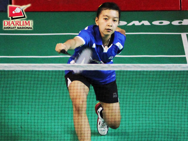 Nadya Puteri Febryana Sari (Mutiara Bandung) sedang mengembalikan kok kepada lawannya yang berasal dari SMP/ SMA Ragunan, Febitria Adhistya.