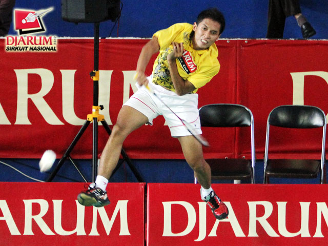 Andreas Adityawarman (Djarum Kudus) sedang memukul kok saat bertanding melawan Teguh Putra (Indo Cafe Medan).