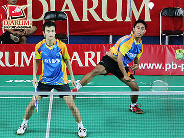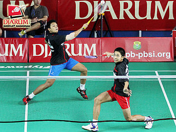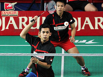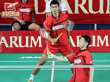 Kevin Sanjaya Sukamuljo yang berpasangan dengan Rafiddias Akhdan Nugroho dari Djarum Kudus sedang memukul kok untuk dikembalikan kepada pasangan Anindyo Pradana / Steven Gozali (Pusdiklat Jaya Raya).