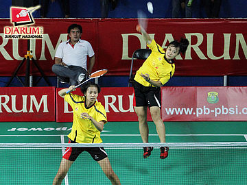 Pasangan R. Eka Fajar K / Rian Swastedian dari Pusdiklat Jaya Raya yang sedang bertanding melawan pasangan Kevin Esra/ Ricky Alverino Sidharta dari Djarum Kudus.