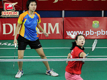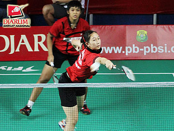 Moue Emi (Hokuto Bank Japan) sedang memukul kok untuk dikembalikan kepada Novalia Agustiani (Tangkas Specs).