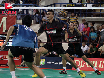 Pemain Tangkas Alfamart, Nova Widianto berusaha mengembalikan kok ke arah pasangan Rendra Wijaya/Rian Sukmawan (PB Djarum).