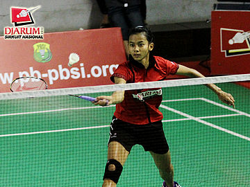 Dinar Dyah (PB Djarum Kudus) saat menyambut serve dari Mega (Jaya Raya).