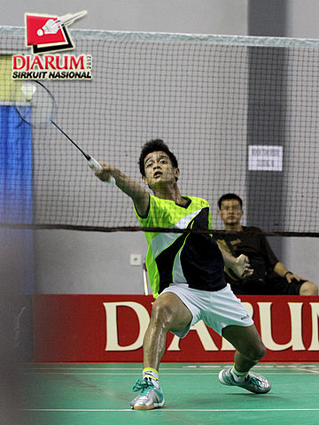 Bayu Pangisthu (PB Djarum Kudus) berusaha mengembalikan bola kepada Setyaldi Putra (Guna Dharma).