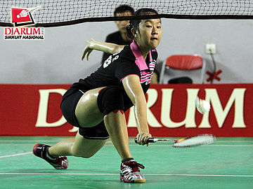 Rusydina Antardayu (Tangkas Specs) berusaha keras untuk bisa mengembalikan shuttlecock ke arah lawannya.