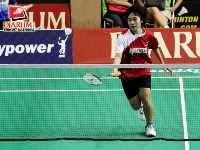 Intan Dwi Jayanti (Djarum Kudus) Mencoba Meraih Bola untuk Dikembalikan kepada Lawan