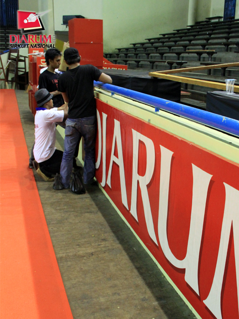 Dua orang panitia sedang memasang backdrop Djarum Sirkuit Nasional diI GOR Kota Baru dalam rangka persiapan menjelang Djarum Sirnas Jambi Open 2012.