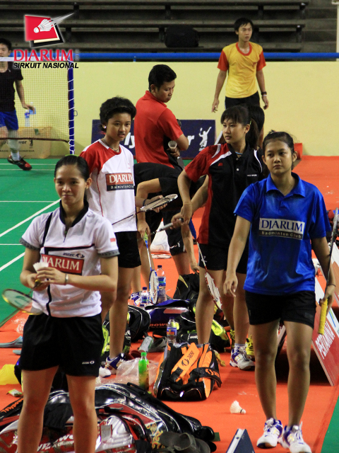 Febby Angguni (kiri depan) dan beberapa orang pemain PB Djarum sedang melakukan pemanasan di GOR Kota Baru Jambi, Senin (26/3).