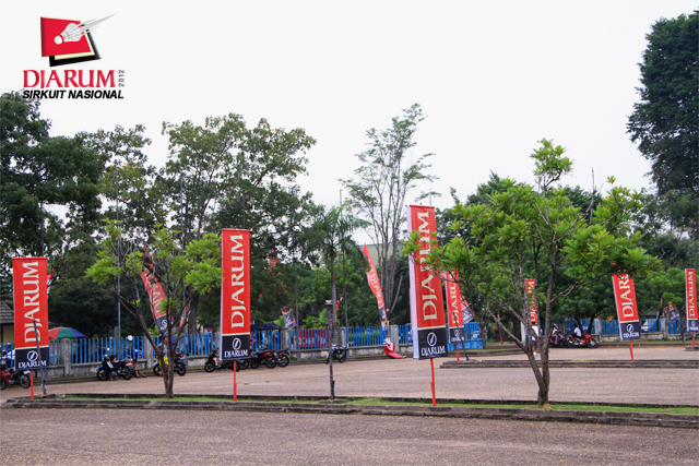 Beberapa spanduk Djarum dipasang di area parkir GOR Kota Baru Jambi.