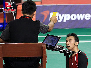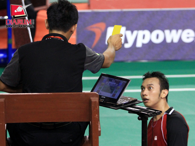 Pemain Ganda Dewasa Campuran asal Jaya Raya Suryanaga, Trikusuma Wardhana yang berpasangan dengan Variella Aprilsasi dikenai kartu kuning oleh wasit dalam pertandingan final melawan pasangan Ardiansyah Putra/Lita Nurlita.
