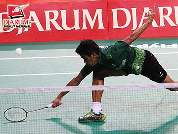 Pasangan Arsya Isnanu Ardi Putra/Hantoro (Djarum Kudus) berusaha mengembalikan kok ke arah pasangan R.E.F/Rian S (Pusdiklat Jaya Raya)