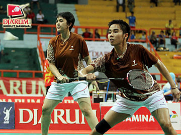 Pasangan Della Agustia Surya/Ristya Ayu Nugraheny (PB Djarum) berusaha mengembalikan kok ke arah pasangan Afni Fadhilah/Putri Sekartaji Pungkasari (Ragunan)