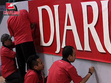 Panitia Djarum Sirnas Palembang 2012 memasang banner Djarum di GOR Dempo.