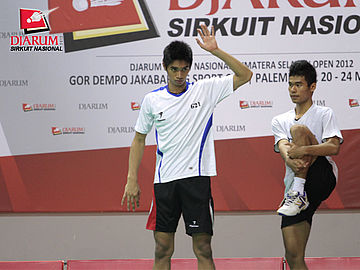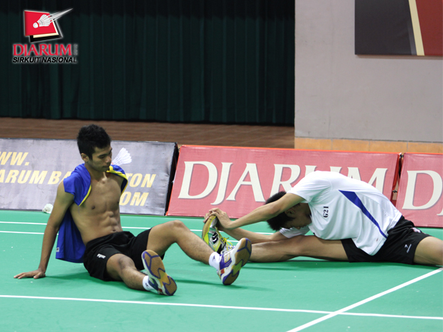 Peserta Djarum Sirnas Palembang 2012 melemaskan otot-otot usai berlatih.
