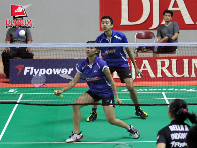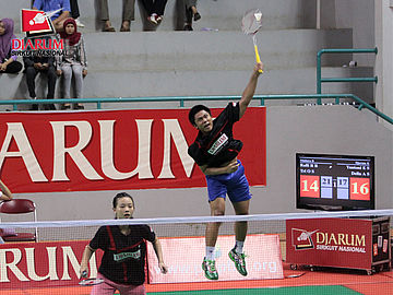 Yantoni Edy Saputra yang berpasangan dengan Della Augustia Surya (PB Djarum) nampak bersemangat saat akan melakukan smash pada pertandingan melawan Rafli Rizki Ristian/Tri Okta Shelina (Mutiara Bandung) di nomor ganda campuran taruna.