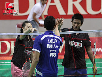 Omori, pemain asal Jepang yang berpasangan dengan Andi Mawardi dari PB Bank Sumsel Babel nampak kelelahan saat bertanding melawan Defri/Irene Wijaya dari PB Pusri di nomor ganda campuran dewasa.