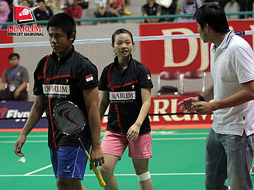 Pelatih PB Djarum sedang memberikan arahan kepada Della Augustia Surya yang berpasangan dengan Yantoni Edy Saputra di nomor ganda taruna campuran saat break pertandingan melawan pasangan Rafli Rizki Ristian/Tri Okta Shelina dari PB Mutiara Bandung.