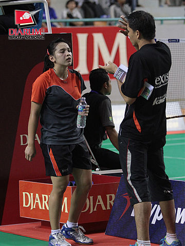 Neng Wulan dari PB Exist Jakarta sedang mendapatkan pengarahan dari pelatih saat break pertandingan melawan Mega Cahya dari Jaya Raya Jakarta di nomor tunggal dewasa putri.