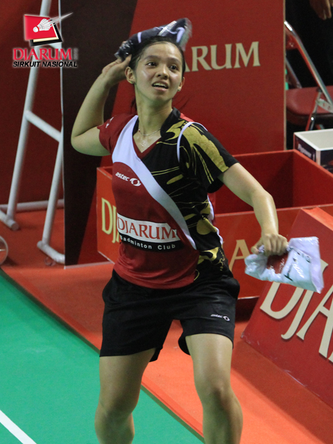 Ekspresi kemenangan Febby Angguni saat berhasil mengalahkan Hanna Ramadini dalam partai final Tunggal Dewasa Putri dengan skor 21-17 dan 21-9.