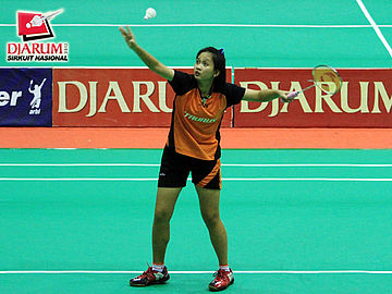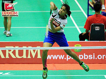 Fina Nuraena (SGS PLN) sedang memukul kok untuk dikembalikan kepada Sheren Regina Natsir (Pelatprov DKI).
