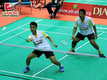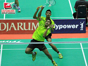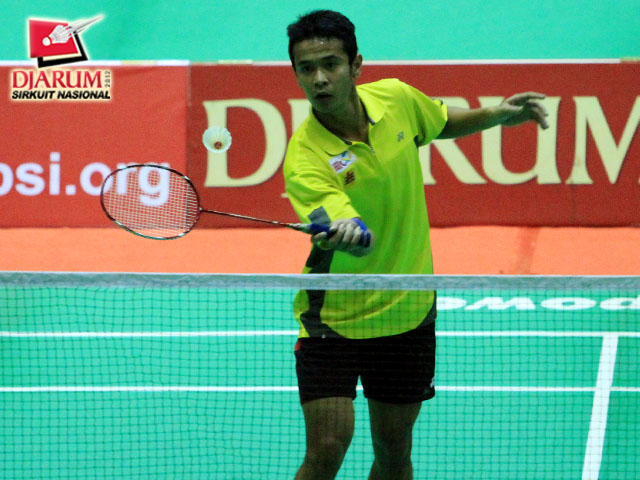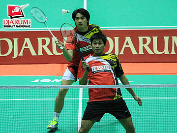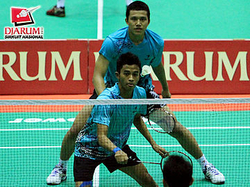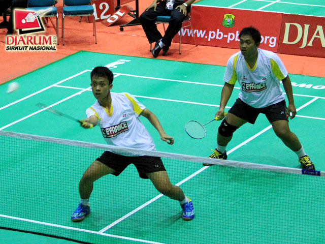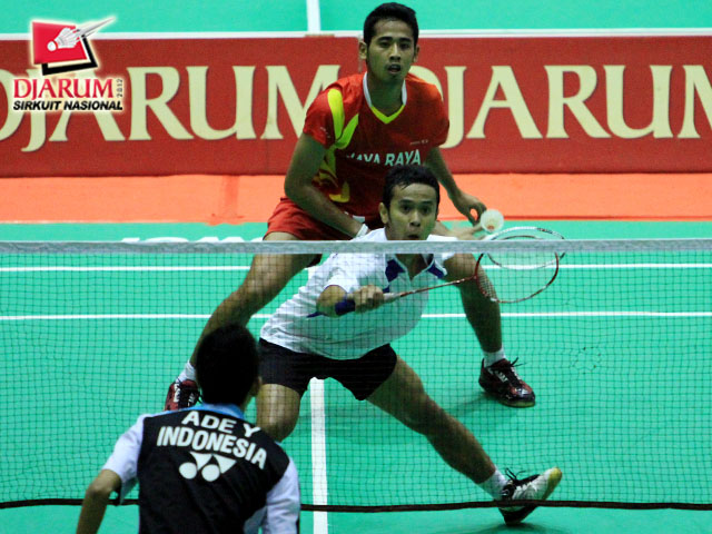 Senatria Agus Setia Putra (SGS PLN) yang berpasangan dengan Hermansyah (Pusdiklat Jaya Raya) siap mengembalikan kok yang di serve oleh pasangan dari Pelatnas, Ade Yusuf Santoso / Wahyu Nayaka Pangkaryaniva.