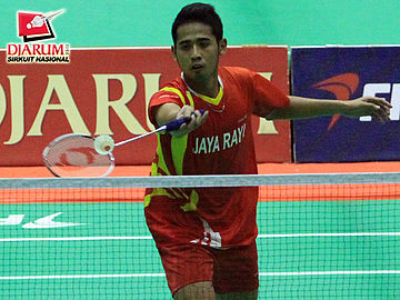 Hermansyah (Pusdiklat Jaya Raya) sedang memukul kok untuk dikembalikan kepada Febriyan Irvannaldi (PBSI Jatim).