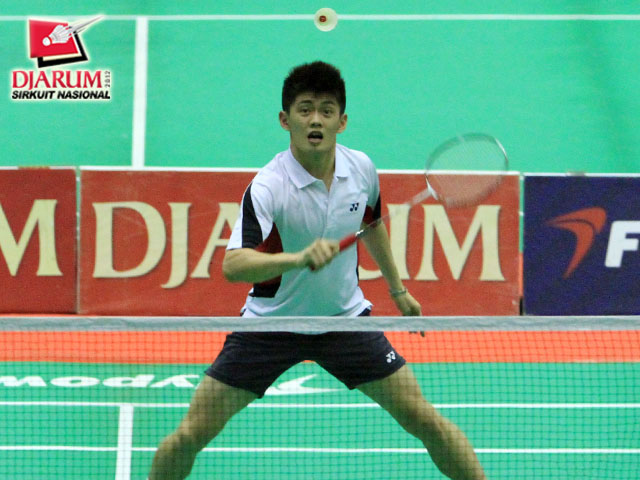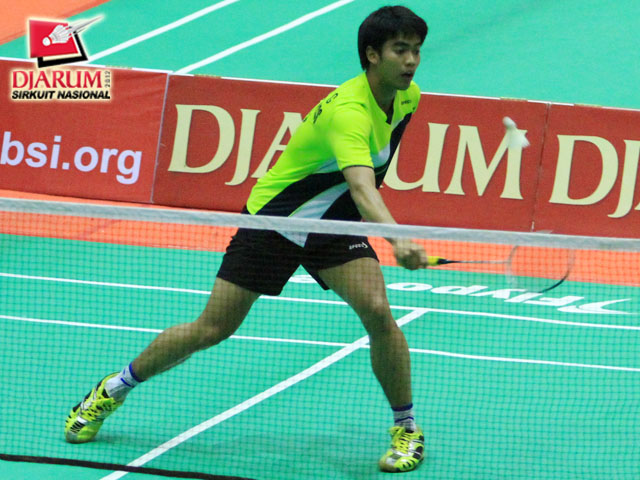 Evert Sukamta (Pelatnas) dalam posisi siap mengembalikan kok kepada Prima Khasna Putra (Pertamina).