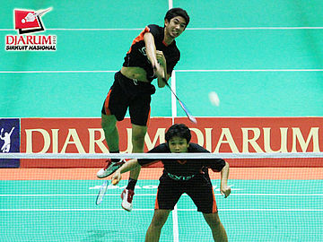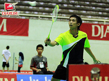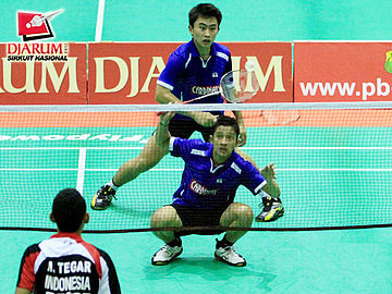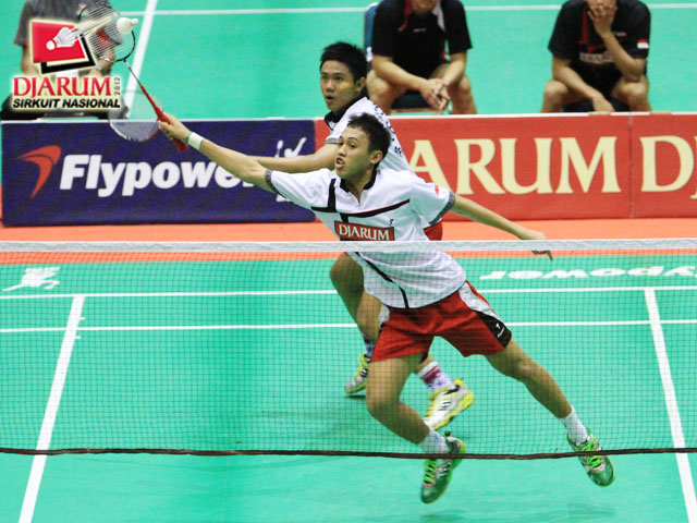 Tedi Supriadi yang berpasangan dengan Yantoni Adi Saputra (Djarum Kudus) sedang berusaha meraih kok untuk dikembalikan kepada pasangan R. Eka Fajar Kusuma / Rian Swastedian (Pusdiklat Jayaraya).