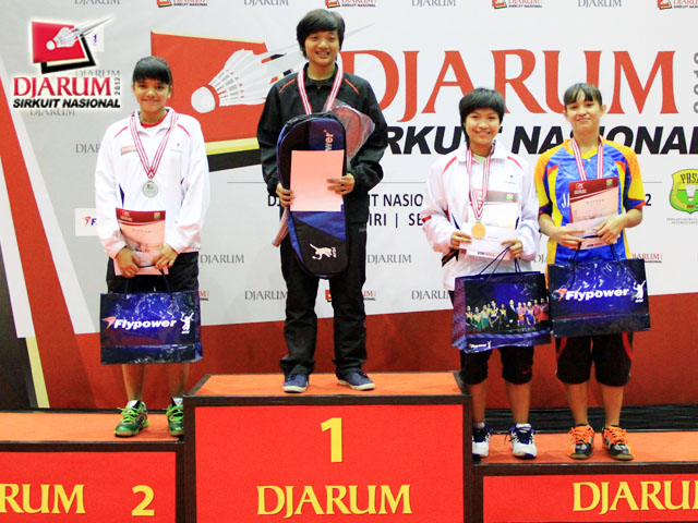 Para pemenang tunggal taruna putri berfoto bersama di podium.