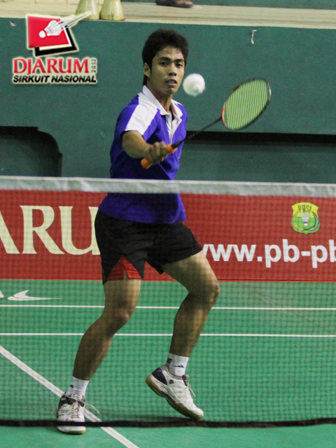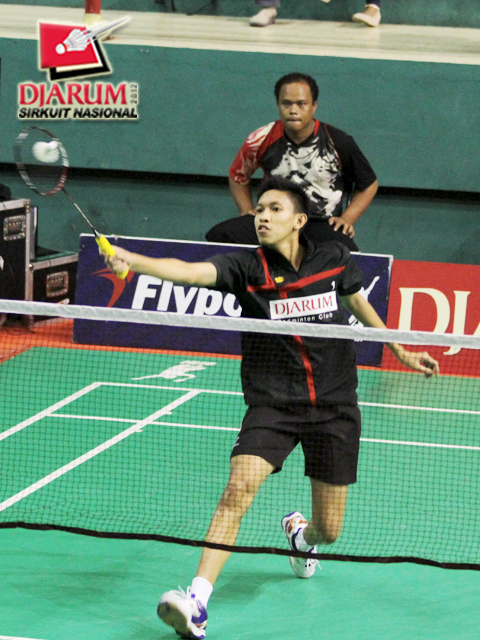 Panji Akbar (Pelatnas) langsung menyambar bola tanggung yang dilepaskan Pandu Dewantoro (PB Djarum Kudus).