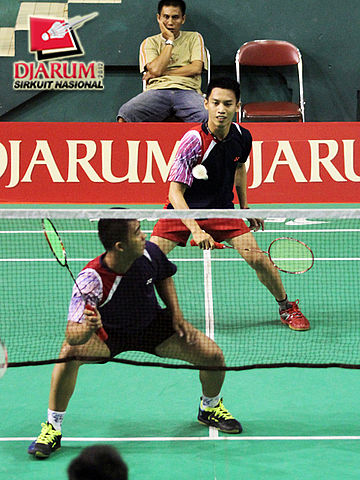 Brian/Dimas (Bintang Terang) berusaha mehadang serangan yang dilepaskan Tedi Supriadi/Yahya Adi (PB Djarum Kudus).