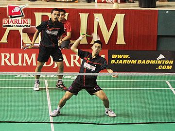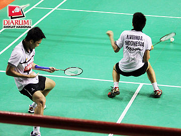 Pasangan Tedi Supriadi/Yahya Adi (PB Djarum Kudus) bersiap menyambar bola tanggung dari Brian/Dimas (Bintang Terang).