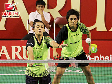 Yuzak Oc/Maya Rosita (Pelindo Marine Service/Citra Raya Unesa) berusaha mengembalikan bola ke arah pasangan Rendra Wijaya/Devi Tika Permatasari (PB Djarum Kudus/SGS PLN).