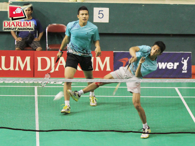 Abu Bakar/Ricky Alverino (PB Djarum Kudus) melepaskan smash keras ke arah Enrico Harly/Hidayat Setiawan (Tangkas Specs).