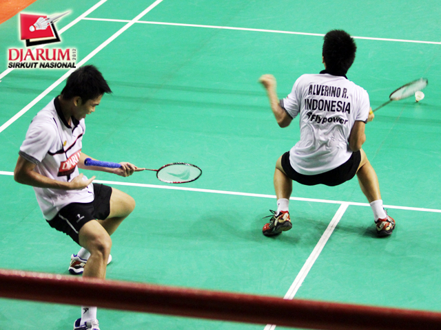 Ekspresi pasangan Abu Bakar/Ricky Alverino (PB Djarum Kudus) setelah memenangi duel sengit dengan Enrico Harly/Hidayat Setiawan (Tangkas Specs).