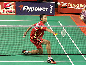 Pebulutangkis tunggal taruna putra, Ari Januari (Tangkas Specs) berusaha menggapai bola dari Bayu Pangisthu (PB Djarum Kudus).
