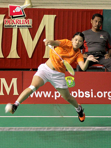 Pebulutangkis tunggal dewasa putri, Sylvinna Kurniawan (Surya Baja) melepaskan smash keras ke arah Rosaria Yusfin (PB DJarum Kudus).
