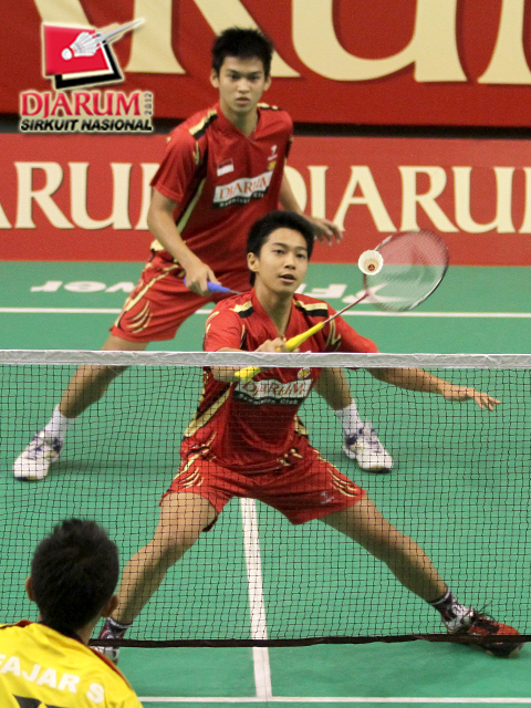 Pasangan ganda taruna putra, Ricky Alverino/Abu Bakar (PB Djarum Kudus) mengembalikan bola ke arah pasangan Ellen Frederika/Fajar Alfian (SGS PLN).