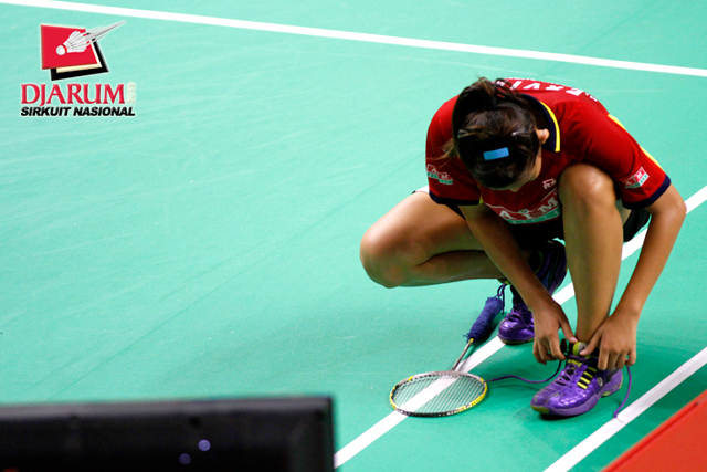 Ervine Felicia (Jaya Raya Suryanaga) mengikat tali sepatunya yang terlepas saat bertanding.