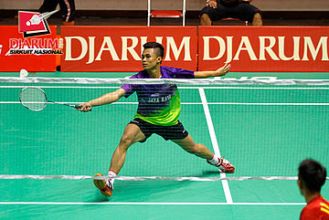 Eka Fajar (Jaya Raya) berusaha menggapai pengembalian shuttlecock dari Azis Iqbal (Gemilang).