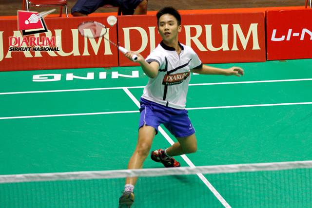 Calvin Ryan (PB Djarum) mengembalikan shuttlecock ke arah Zico (PPLP DKI Jakarta).