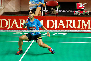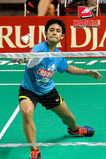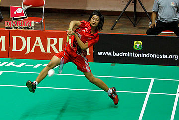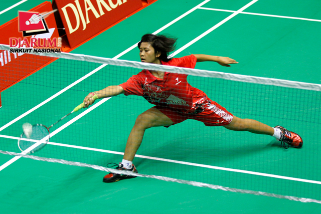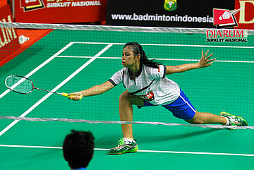 Berliyan Sudrajat (Semen Gresik) berhasil menggapai pengembalian shuttlecock dari Devi Yunita Indah (PB Djarum).