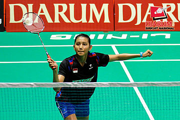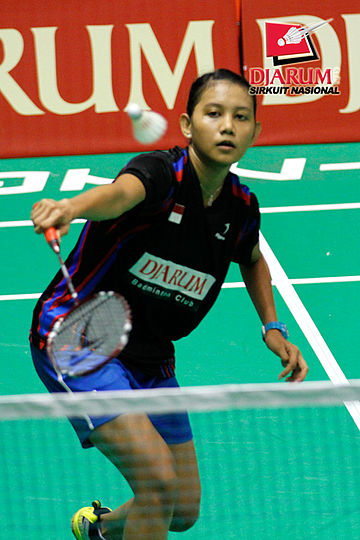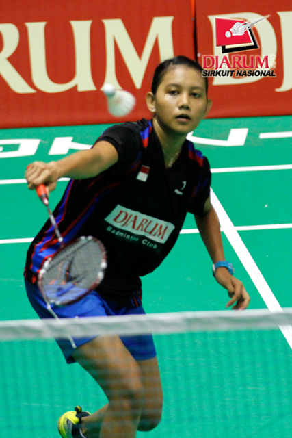 Devi Yunita Indah (PB Djarum) menyambar pengembalian tanggung dari Berliyan Sudrajat (Semen Gresik).
