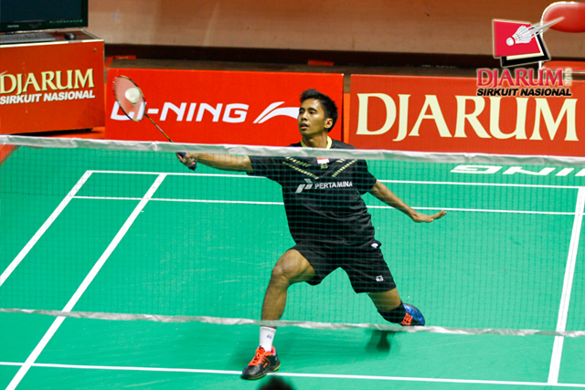 Alamsyah Yunus (Pertamina Indonesia) mengembalikan shuttlecock ke arah Gayus Elputra (Rasella Bandung).