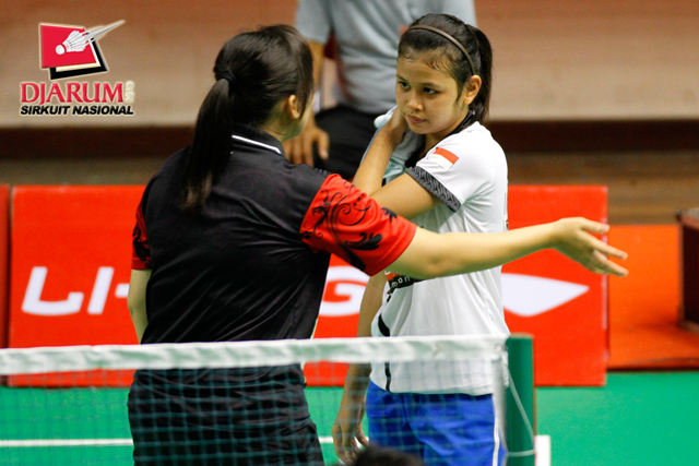 Putri Sekartaji (Mutiara Bandung) mengembalikan shuttlecock ke arah Rifa putri Aida (PB Djarum).