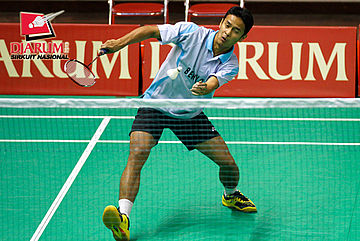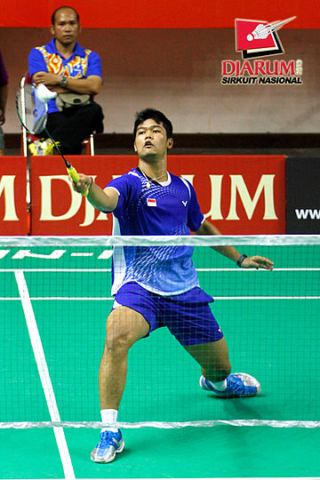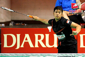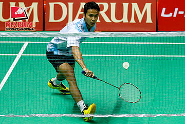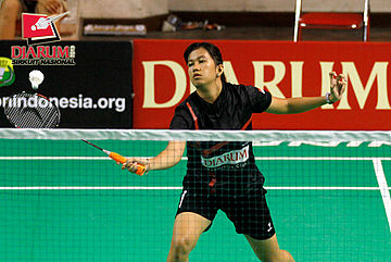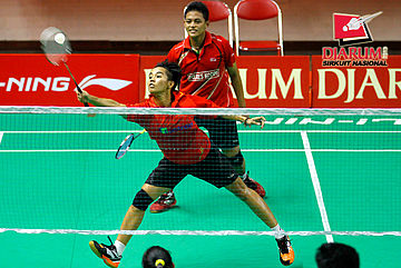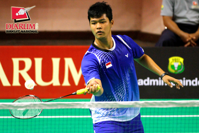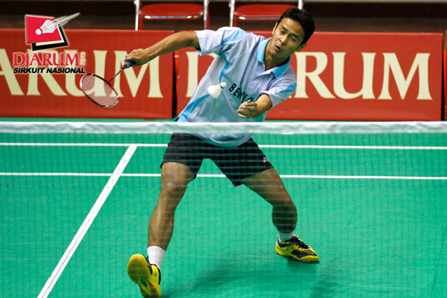 I Putu Roy Danu (Semen Gresik) mengembalikan shuttlecock ke arah M. Shulton Al-Hakim (Mutiara Bandung).