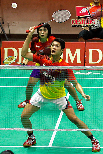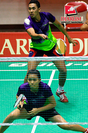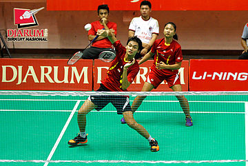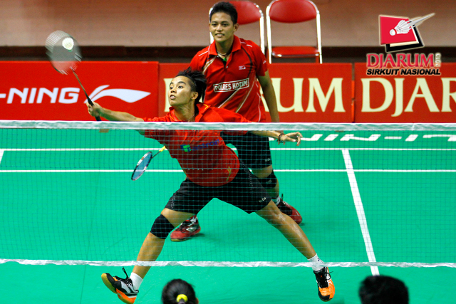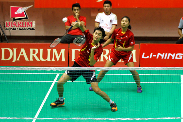 Ardiansyah Putra/Devi Tika Permatasari (Pertamina Indonesia/SGS PLN) bersiap menyambut pengembalian shuttlecock dari Riyo Arief/Nadya Melati (Hi Qua Wima/Pertamina Indonesia).