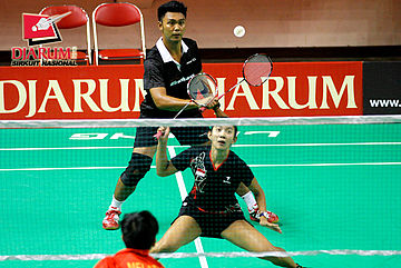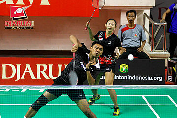 Riyo Arief/Nadya Melati (Hi Qua Wima/Pertamina Indonesia) menyambar pengembalian tanggung dari Ardiansyah Putra/Devi Tika Permatasari (Pertamina Indonesia/SGS PLN).