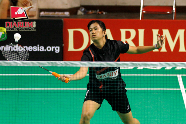 Melisa Andesti (PB Djarum) mengembalikan shuttlecock ke arah Vioni Florencya (Tangkas Specs).