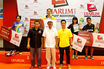 Mychelle Crhystine/Rofahadah Supriadi (PB Djarum) bersiap megembalikan shuttlecock ke arah Dianita Saraswati/Yulfira Barkah (Mutiara Bandung).